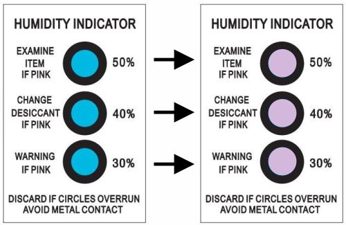 При получении поставки электронных компонентов конечный пользователь может сразу проверить состояние индикаторной карты: если цвет пятен остался неизменным (в исходном синем состоянии), это свидетельствует о том, что упаковка сохраняла герметичность, а компоненты всё время находились в требуемых условиях. В случае изменения цвета на розовый — это сигнал о том, что влажность внутри упаковки превысила допустимые значения, и компоненты, возможно, подверглись риску повреждения. Таким образом, индикаторы играют важную роль в обеспечении качества, надежности и соответствия требований стандартам обращения с влагочувствительными изделиями в электронной промышленности.