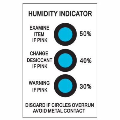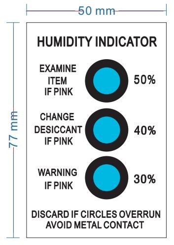 Индикатор влажности RH30%-40%-50%, с диапазонами срабатывания 30% 40% 50% относительной влажности, для визуального контроля микроклимата внутри герметичной упаковки, содержащей влагочувствительные электронные компоненты. Такие индикаторы позволяют оперативно выявить проникновение влаги или превышение допустимого уровня влажности в процессе хранения и транспортировки.