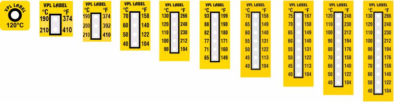Наклейка VPL Thermolabel состоит из одного или нескольких кругов, каждый из которых соответствует определённой температуре (например, 90°C, 100°C, 110°C). При достижении этой температуры белый круг необратимо меняет цвет на красный, фиксируя факт превышения порога. Это позволяет при плановом осмотре сразу выявить проблемные узлы без использования сложного оборудования.